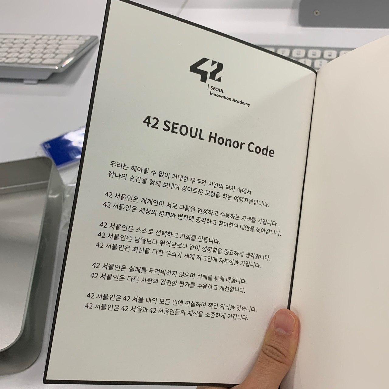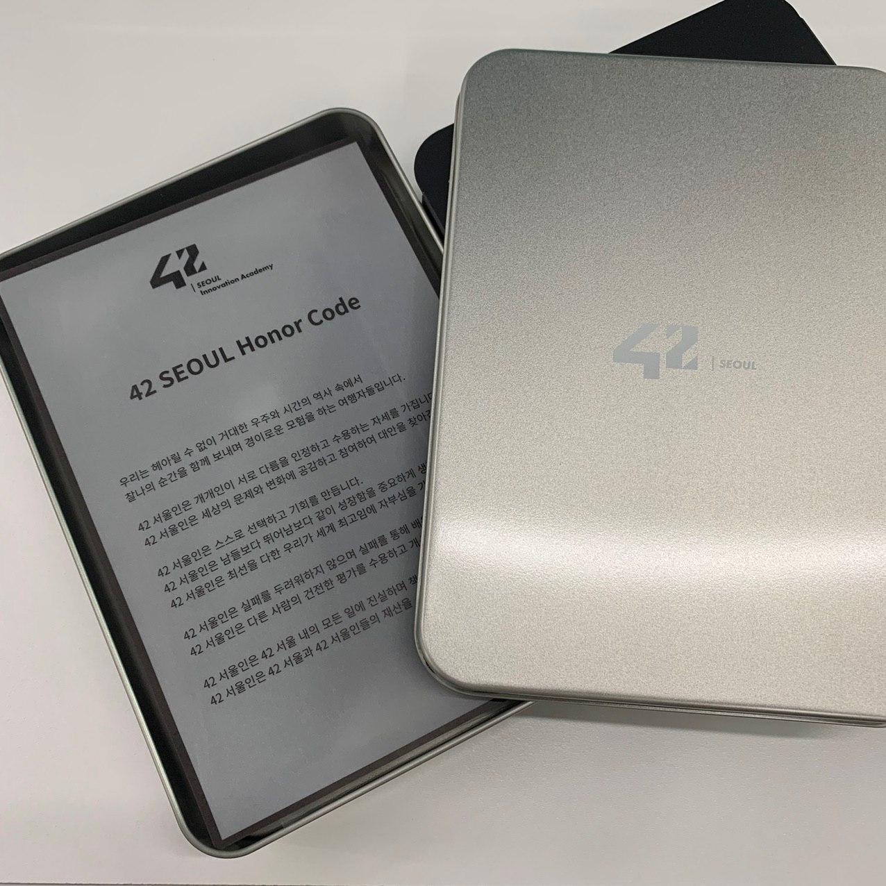와서 출입증과 웰컴킷을 받았다. 웰컴킷 학장님 사인 옆에 /*0x5E~*/ 이 16진법 숫자를 타임스탬프에 넣으면, 우리가 원래 등교해야 했던 2월의 어느날이 나온단다. 검은 색 포장 속에 틴케이스를 거내면 42seoul 로고가 있고, 열어보면 트레이싱지에 프린팅된 아너 코드가 나온다.