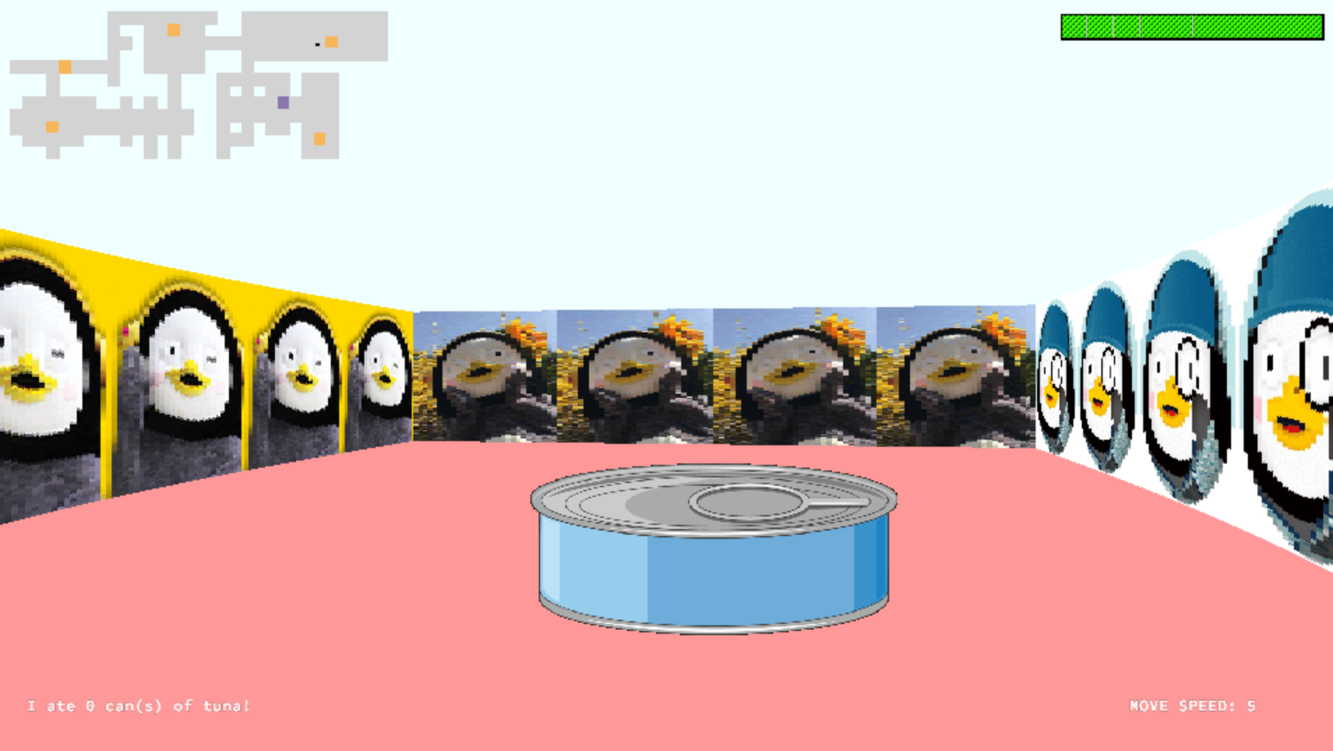컨셉은 '펭수' ㅎㅇㅎ 맵 상의 참치 캔을 다 먹으면 게임이 끝난다. 미니맵 상의 노란색이 참치가 위치한 지점. 보라색 지점은 펭수가 서있다. 게임을 다하면 game clear라는 이미지가 뜬다. bgm도 나온다.