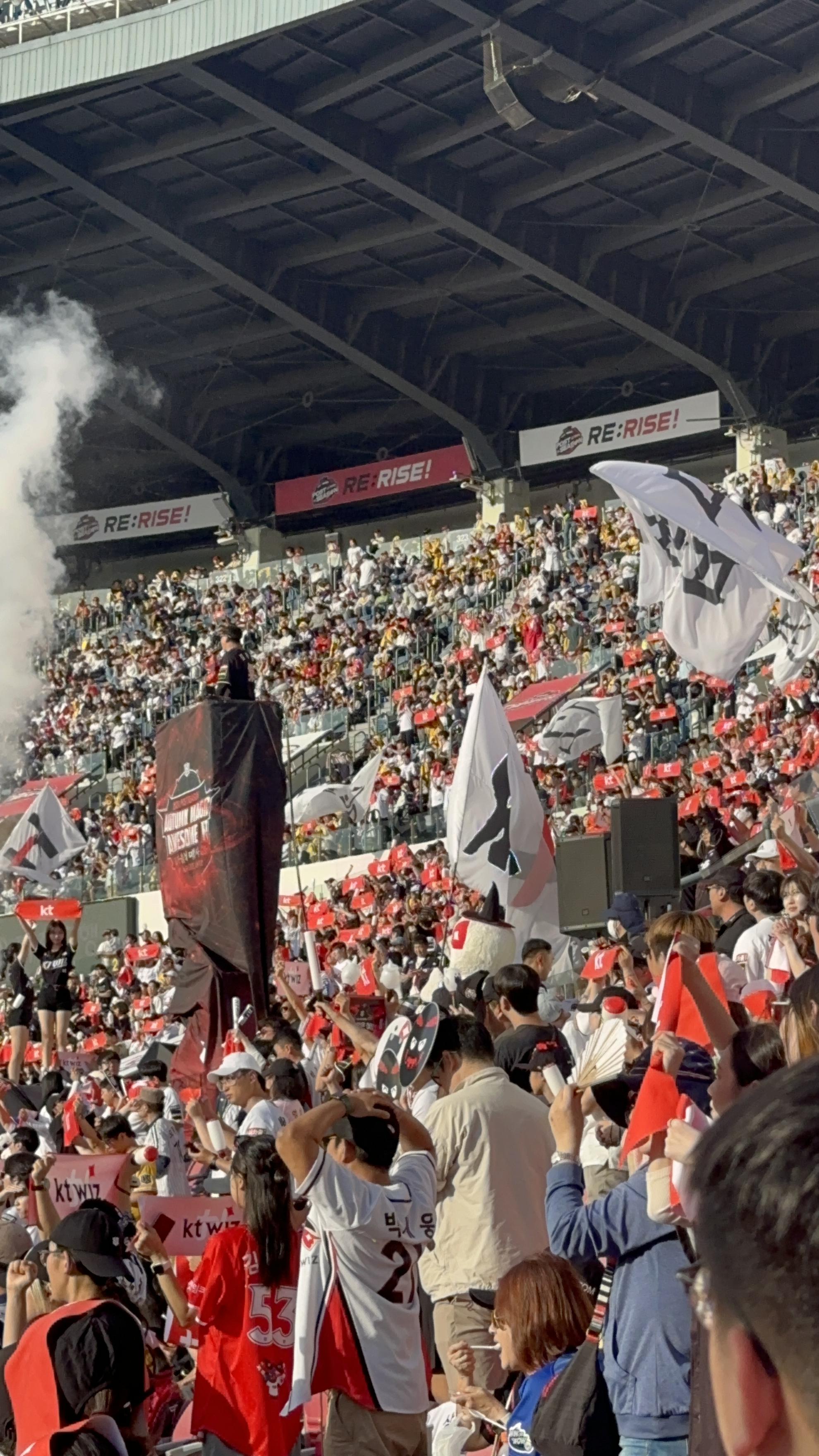 마지막 경기를 보고 나선 여운이 굉장히 많이 남았는데, 절박한 모습 때문인 것 같다. 야구를 보기 시작했을 때 kt는 뒤에서 두 번째인 9등이었다. 그런데 점차 올라가더니 벼랑 끝에서 몇번이고 승리를 이뤄냈다. 5위를 결정짓는 타이브레이크 경기에선 역전승을 거두고, 와일드카드 전에서는 전례없던 업셋을 이루고, 준PO에서도 4차전에서 연장 끝에 승리해 5차전까지 경기를 끌고 갔다. 비록 준PO 5차전에서 져서 도전이 마무리되기는 했지만, 멋진 도전이었다. 이 벼랑 끝 경기 8개 중 5개를 직관을 했으니, 도파민이 터져 안 터져!
